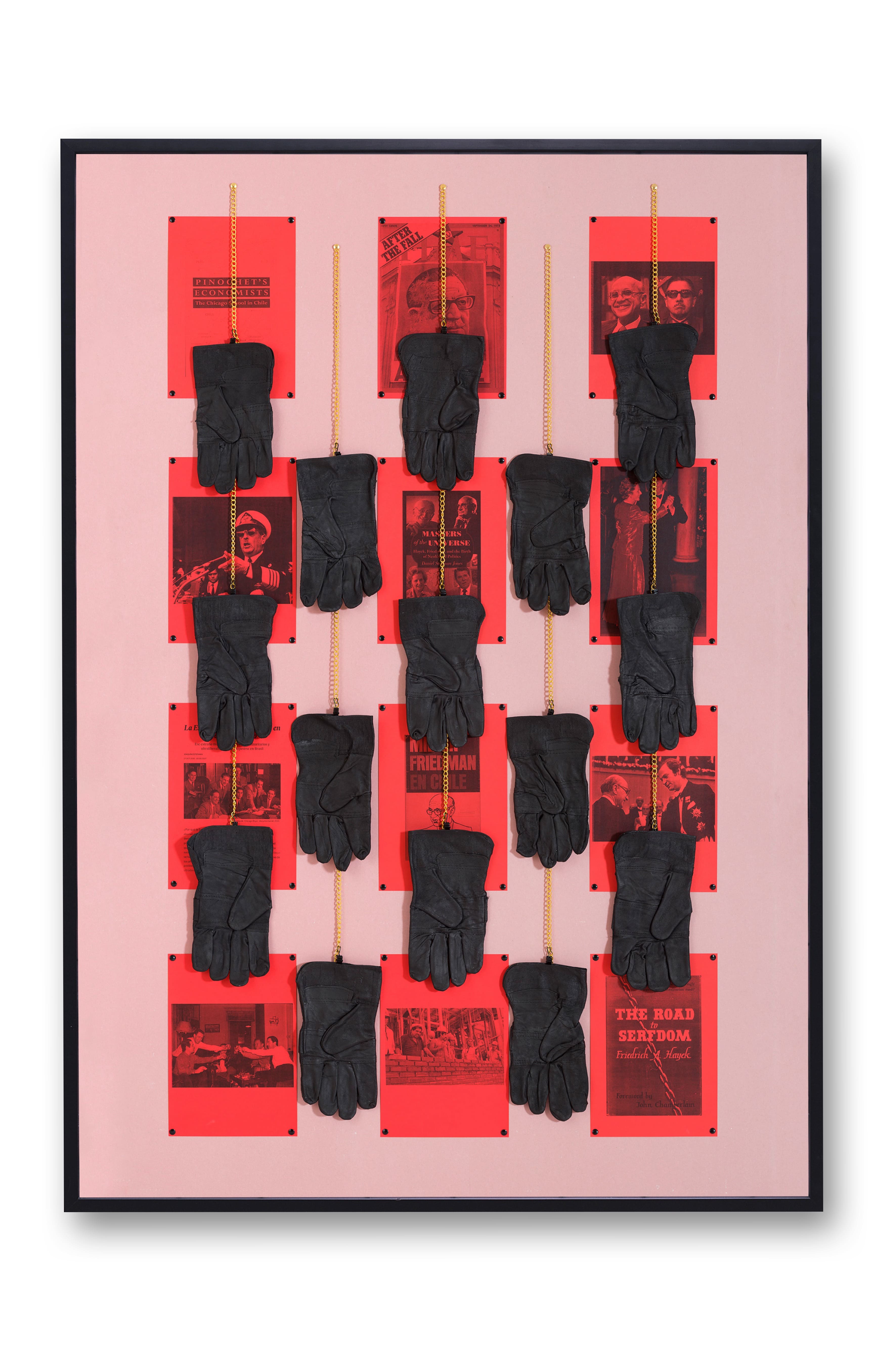 Con The Chicago Boy’s Project (La mano invisible #3), 2019, Patrick Hamilton –artista nacido en 1974 en Bélgica, pero asentado en Chile- habla del gobierno chileno y la violencia estatal que llevó a cabo en nombre del libre mercado. Se trata de una instalación construida a partir de impresiones sobre papel rojo de cartas, fotografías, portadas de revistas y libros relacionados con la historia del neoliberalismo en Chile. Estos distintos recursos son presentados en un formato de muro de evidencias criminales.