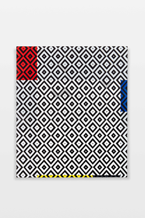 En el caso de la obra de Paul Muguet (Ciudad de México, 1975), se retoman distintos motivos textiles de la cultura visual mexicana y se recontextualizan en el mundo del arte. El artista recupera los diseños de los típicos sarapes de Saltillo, cuyo formato e intensidad cromática acapara la atención del espectador; y de los tapetes zapotecos, cuya estridencia en los patrones con forma de rombo emulan movimiento. En ambas series se emplean los pigmentos -tal cual provienen del tubo de pintura- y la cinta adhesiva para entretejer esmaltes y óleos en un entramado de secuencias libres.