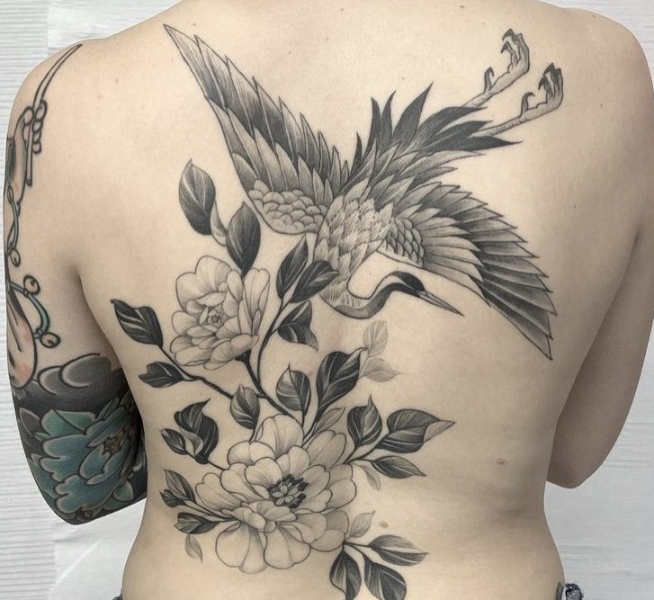 Peonias, sakuras, camelias, crisantemos. Las composiciones de Aura se enraízan en el mundo botánico, pero no desde la fragilidad, sino desde la resistencia. A menudo aparecen acompañadas de serpientes, mariposas o escorpiones, creando un equilibrio visual y simbólico entre lo apacible y lo peligroso, entre la vida y la transformación.